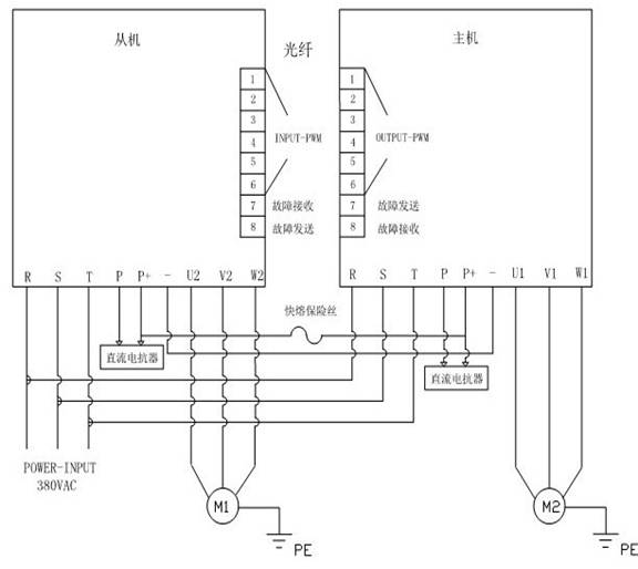 變頻器實(shí)現(xiàn)同步運(yùn)行:選取安邦信AM300系列挖沙機(jī)械專用變頻器400KW兩臺,標(biāo)配2臺直流電抗器,共直流母線,定義一臺主機(jī)一臺從機(jī),主機(jī)實(shí)現(xiàn)控制,從機(jī)只作監(jiān)控。主機(jī)與從機(jī)之間通過光纖通訊(PWM傳送及故障互鎖),確保輸出同步。