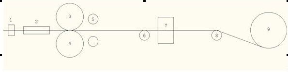 唐山市豐潤區玄龍鋼鐵有限公司鋁連鑄連軋機的主要工作是將經原爐熔煉、靜止爐精煉后的高溫鋼液在快速冷卻的同時軋制成鋼板,最終通過卷取機卷成鋼卷。該設備主要有主軋機、鋼液位控制裝置、鈦絲進給、鑄嘴小車、石墨噴涂及行走、平動液壓剪、卷取機、卸卷車等,如圖所示。